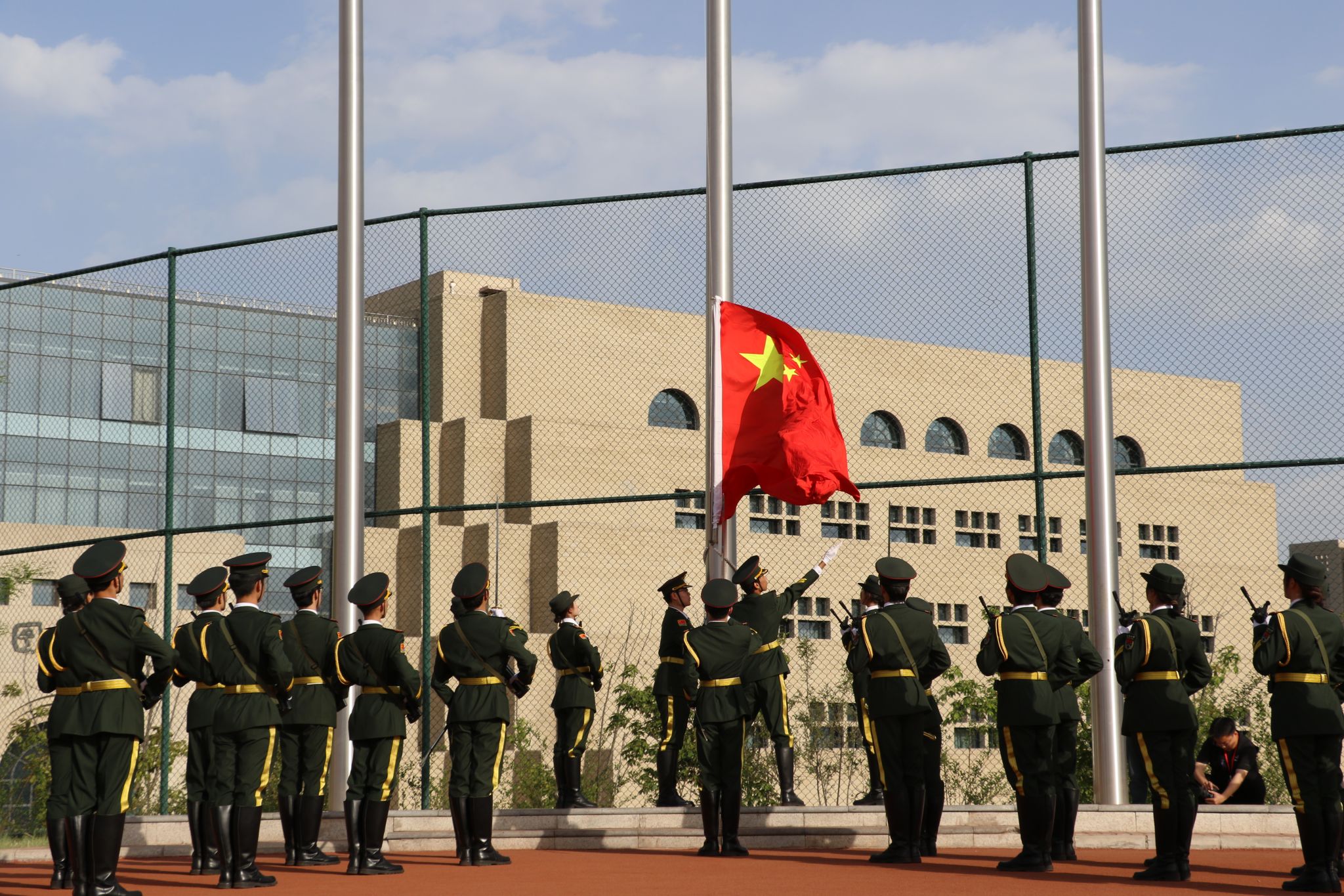在雄壮的《运动员进行曲》旋律中,会旗、国旗护卫队、花环校徽方阵、校训及题词方阵、红旗方阵、裁判员方阵、机关方阵及各参赛单位方阵依次入场。他们以整齐的队列,迈着矫健的步伐走过主席台前,展现出昂扬的精神与蓬勃的朝气。全体人员入场列队后,举行了庄严的升国旗仪式。