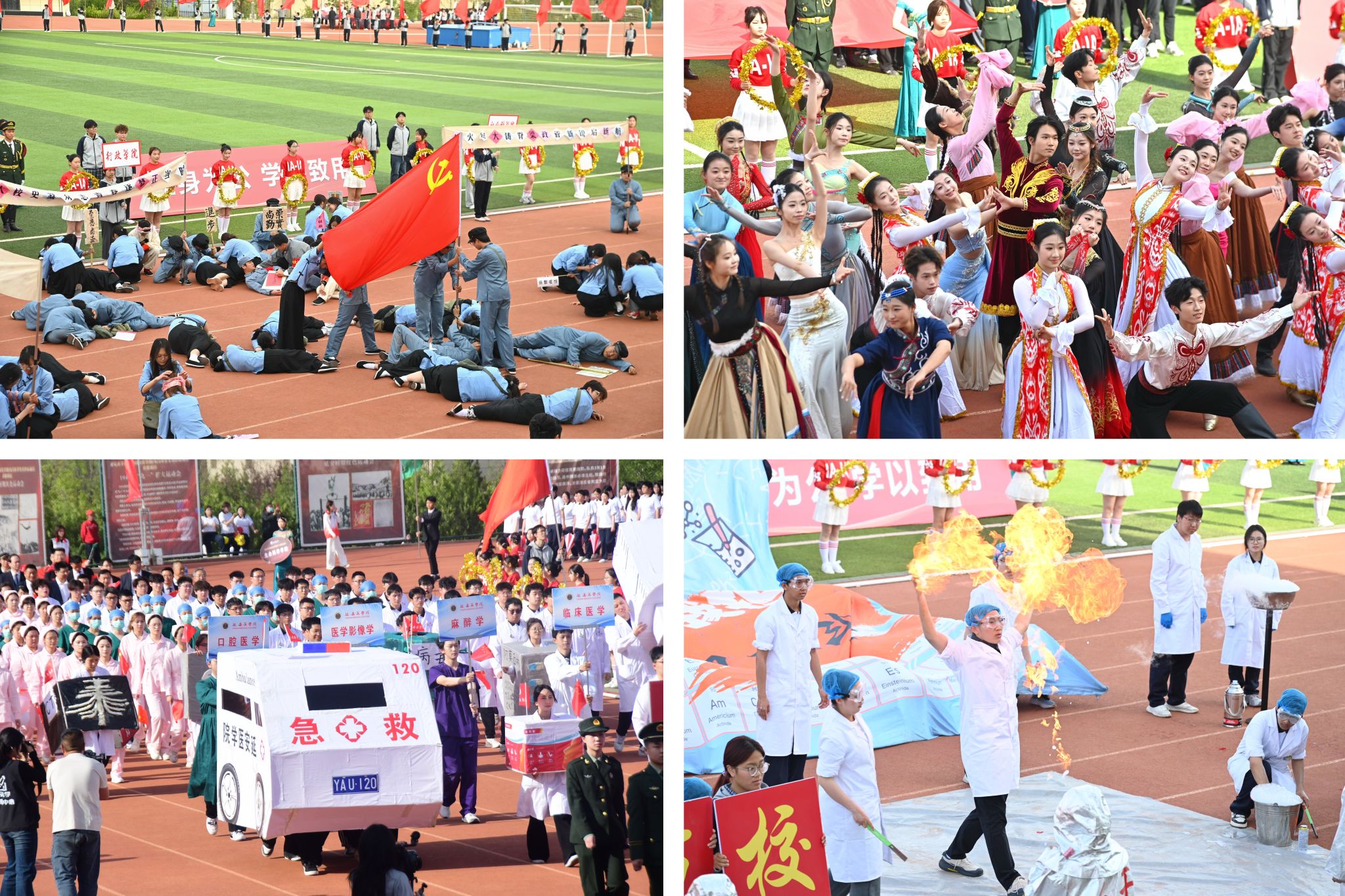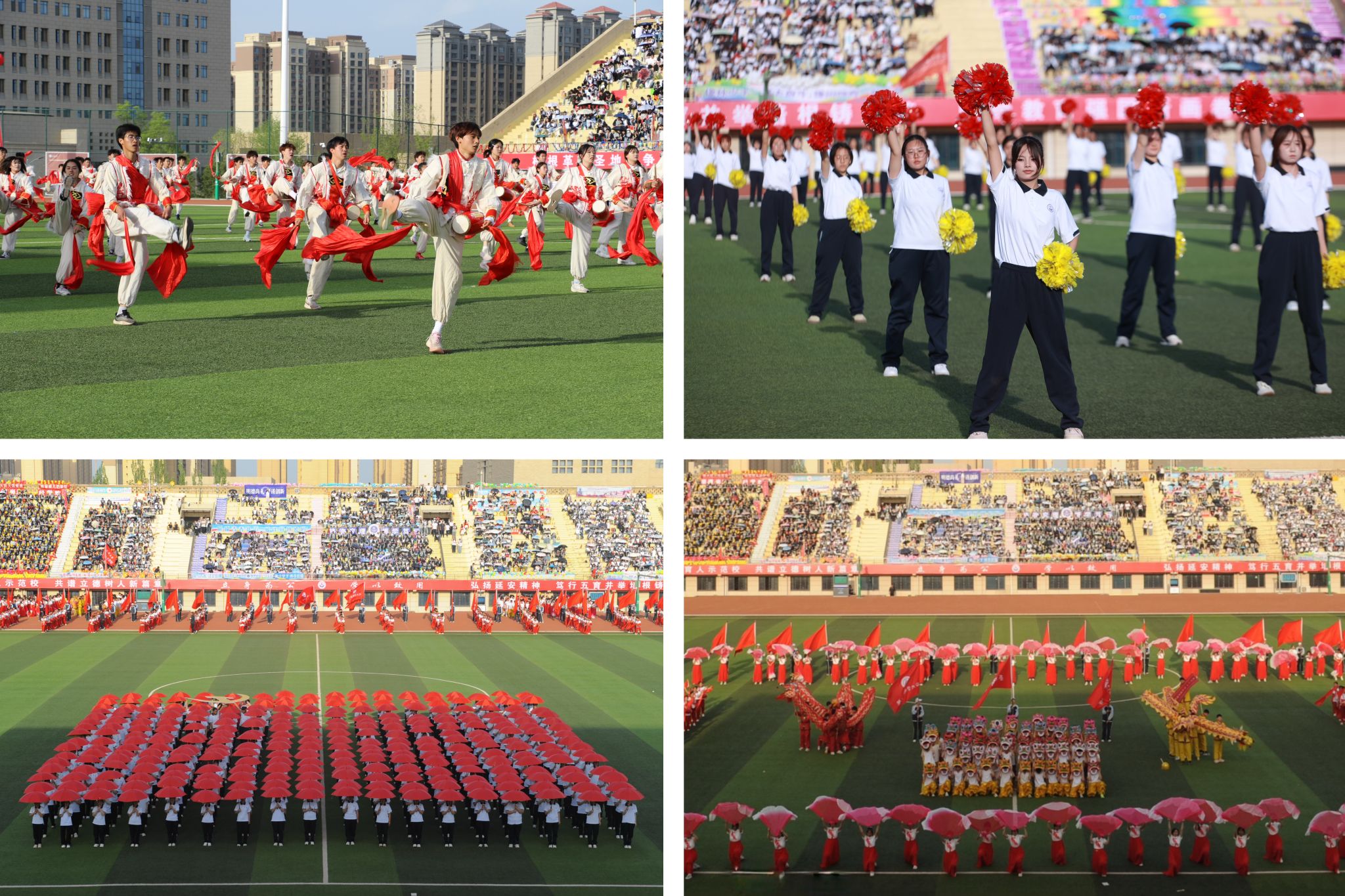 在文体表演中,体育学院、教育科学学院、经济与管理学院、基础教育中心的上千名大中小学师生先后上场,带来安塞腰鼓、韵律操、舞动中国及“延河潮·少年志”等精彩的大型文体表演。鼓点震天彻地,红绸迎风飞舞;身姿舒展朝气,舞步凝聚力量,共同勾勒出壮美的青春画卷。附属中小学的少年,高声呐喊、踏歌而来,宣告着延河少年的豪情与壮志。