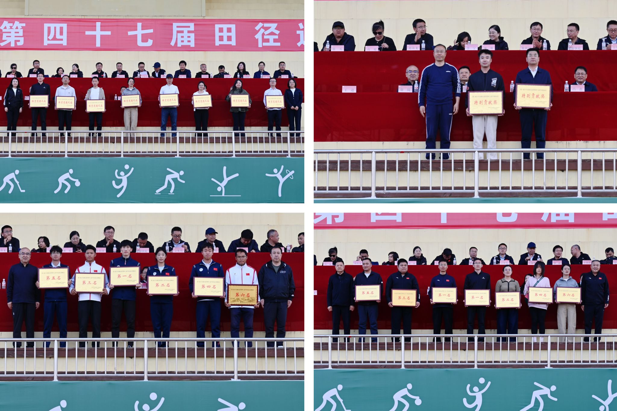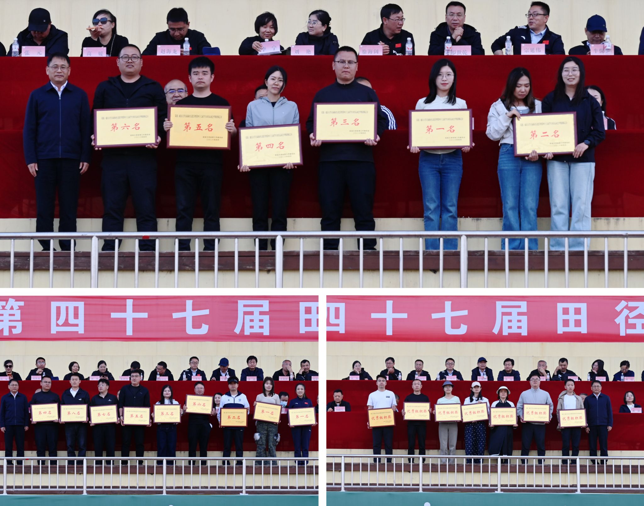吕磊为学生甲组团体总分前六名代表队、学生红色运动会获奖单位、优秀组织单位颁奖;刘小淼、国际交流与教育学院院长成铭为体育道德风尚奖获奖单位颁奖;党校办主任贺启翔为特别贡献奖获奖单位颁奖;学工部部长张翔、财务处处长谢岗为学生乙组团体总分前六名代表队颁奖;工会主席杨曦东、体育学院院长宗有智为教职工团体总分前六名代表队颁奖。